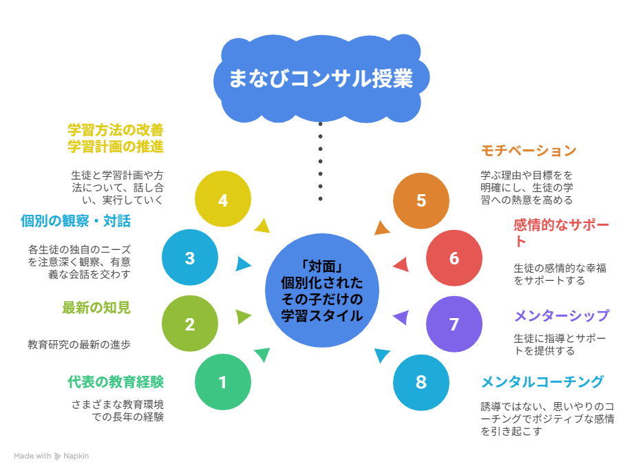 その子に合った効果的な方法を、22年間の教育現場経験(インターナショナルスクール、公立小学校、市立大学、中学生対象集団指導塾、ガーナの高等学校)を持つ代表が、最新の知見を常にアップデートしながら、その子を「よく観て」進めていくスタイルのことです。