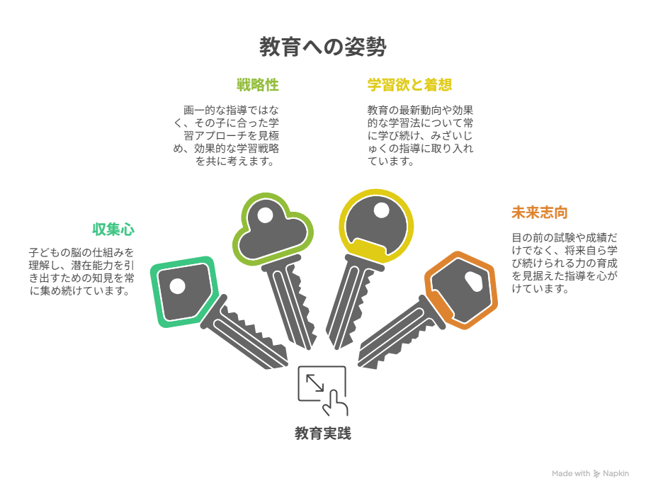 - 学習欲と着想:教育の最新動向や効果的な学習法について常に学び続け、みざいじゅくの指導に取り入れています。