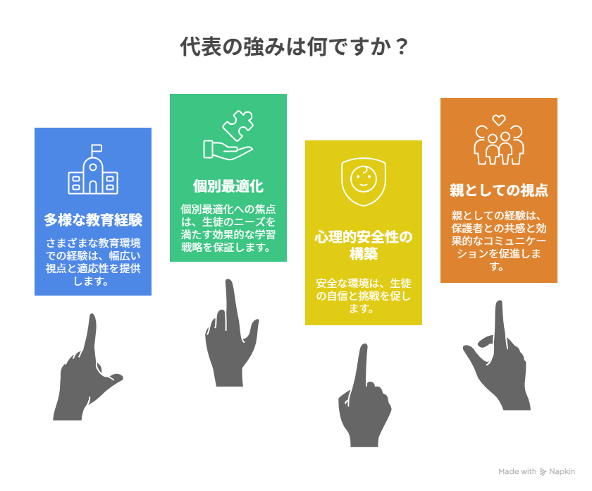 - 個別最適化への着眼:教育現場で出会った多様な子どもたちとの関わりを通じて、「一人ひとりに合った学び方」を模索し続ける姿勢を大切にしています。