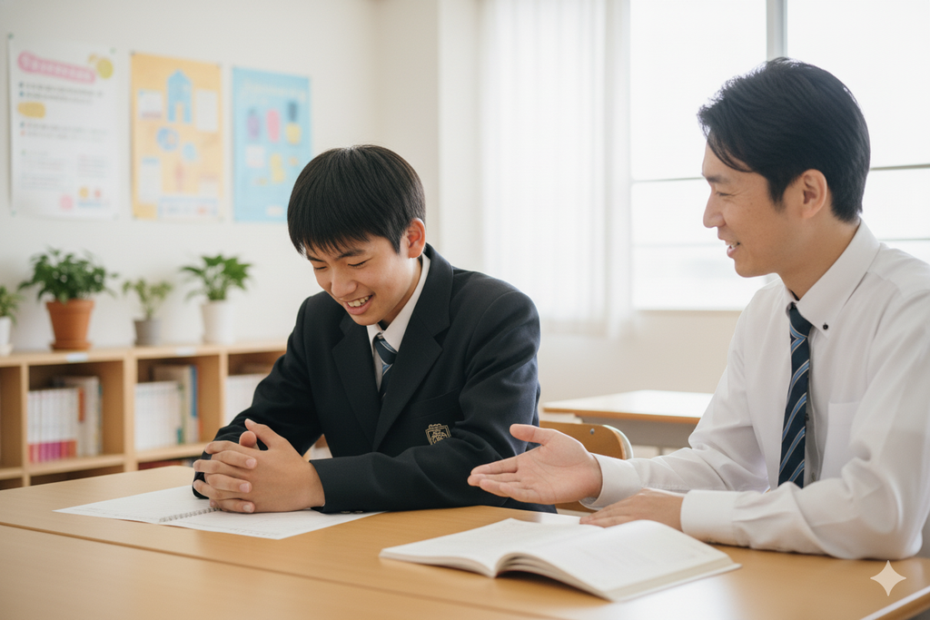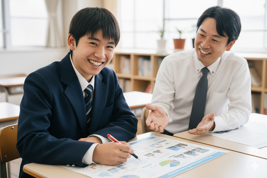 大輝:「先生との対話を通じて、自分が視覚的に情報を整理すると理解しやすいタイプだとわかりました。それからは、教科書の内容を図や表にまとめる習慣がつきました。自分に合った勉強法がわかると、効率よく学べるし、何より楽しくなりました。先生は『正解は一つじゃない』『自分に合った方法を見つけることが大切』といつも言っていて、その言葉が心に残っています」