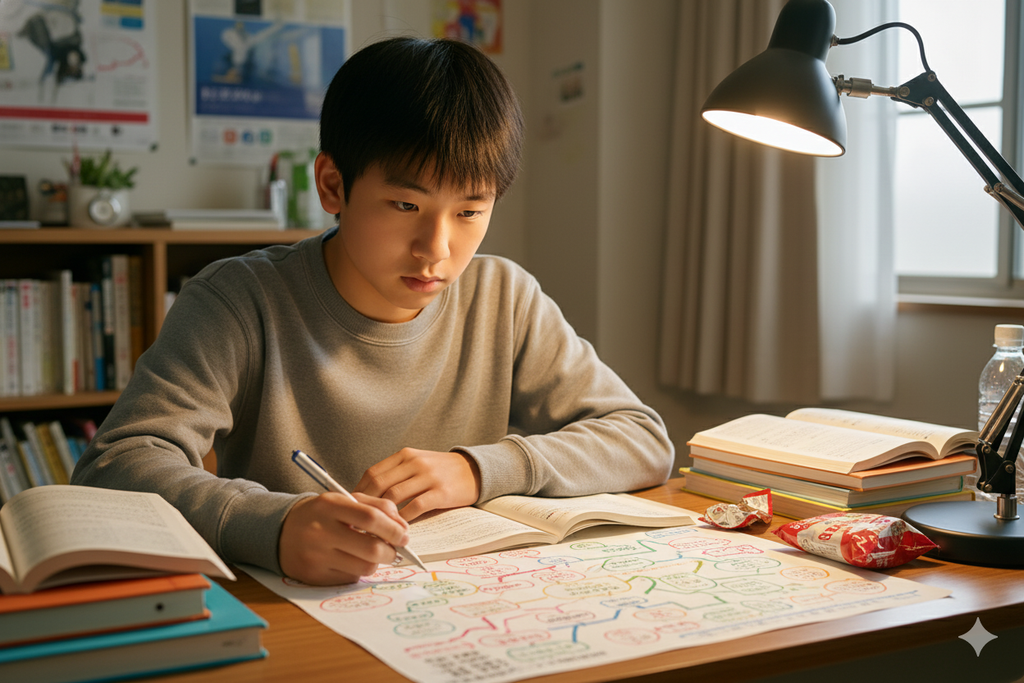 大輝:「受験勉強って言うと、ただひたすら問題を解くイメージでしたが、みざいじゅくでは『自分に合った学習法』を見つけることから始めました。僕の場合、図や表にまとめると記憶に残りやすいことがわかって、各教科をマインドマップにまとめる勉強法を取り入れました。志望校も『偏差値だけで選ぶ』のではなく、『自分がやりたいことができる環境か』を基準に選びました」