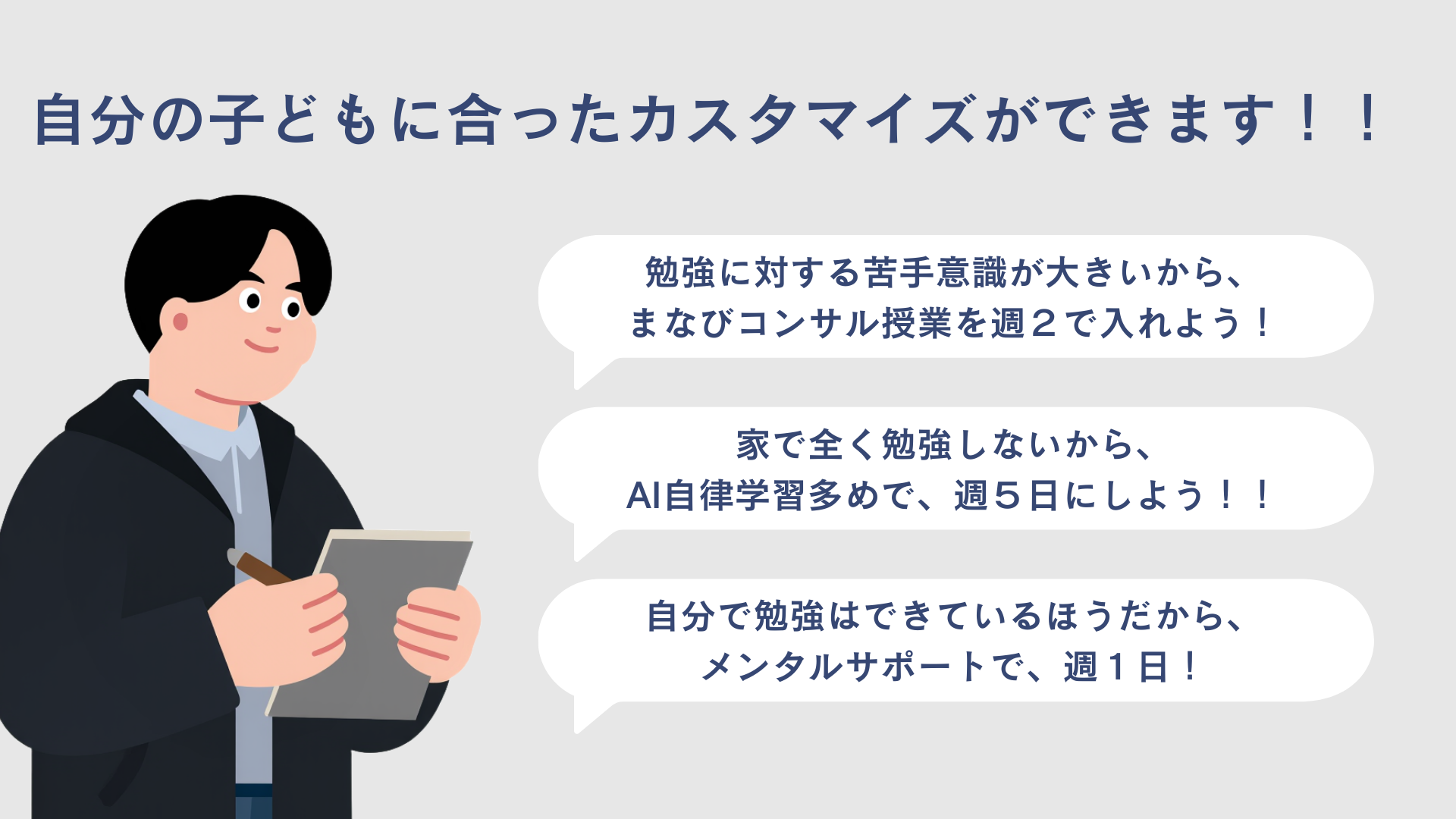 ★お子さまに応じて、まなびコンサル授業、自律AI学習の回数を組み合わせることができます。