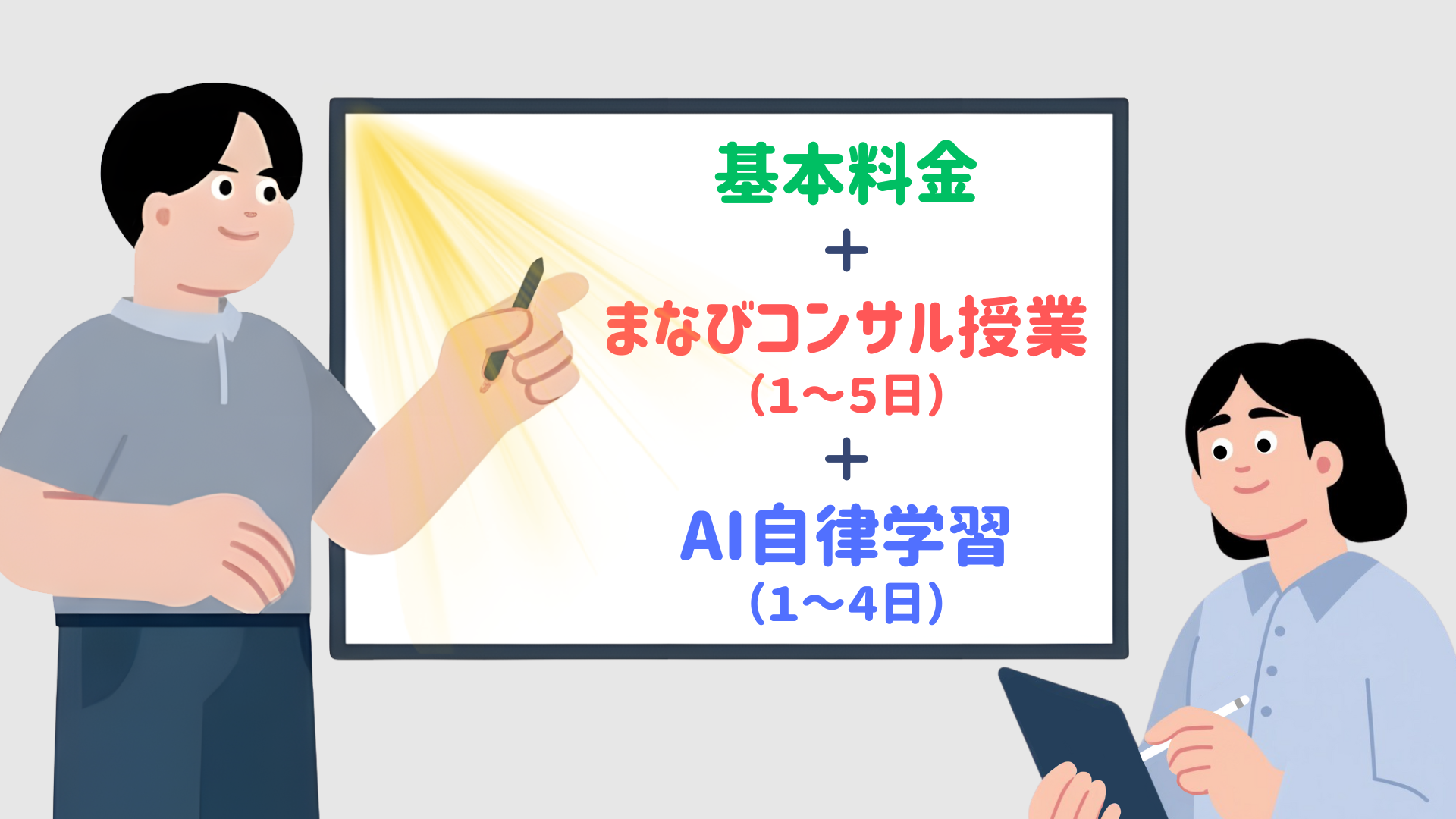 | 【基本料金】 | ✙【まなびコンサル授業 】 | ✙【自律AI学習 】 (塾内スペース) | |