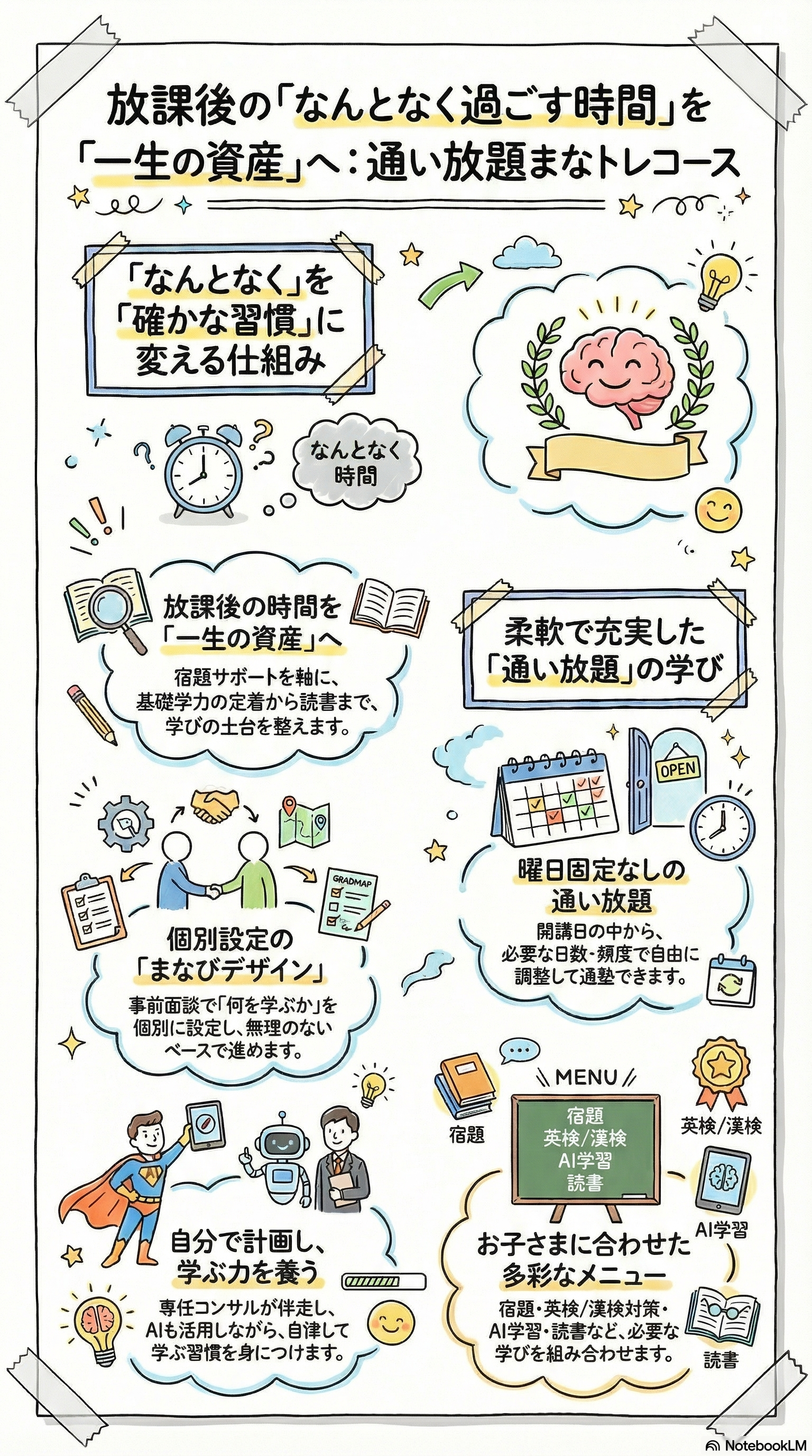 宿題サポートを軸に、基礎学力の定着、英検・漢検対策、AI学習、読書など、お子さま一人ひとりに合わせた学びを組み合わせます。