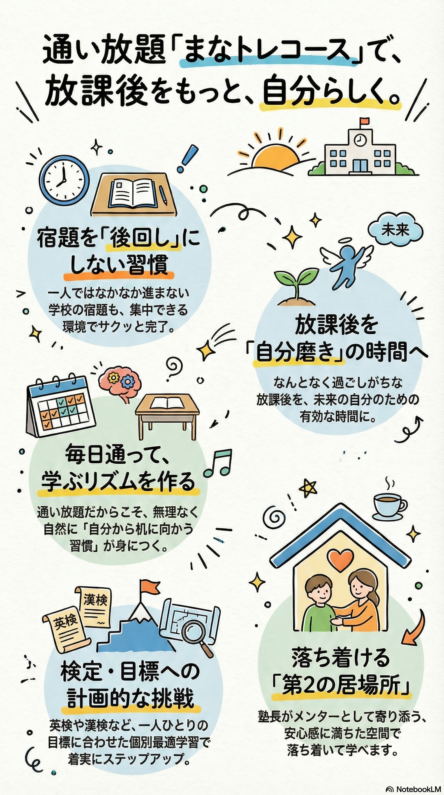 - 目的:放課後の学習習慣をつくり、宿題・基礎学力・検定対策を安定化