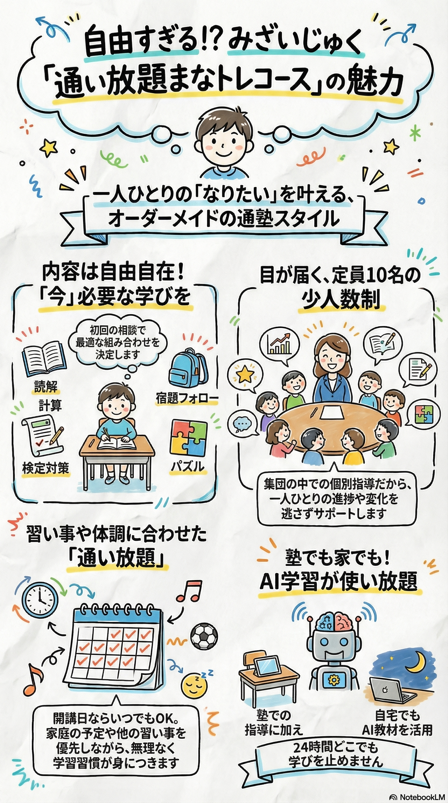 - AI学習使い放題:自宅でも塾でも、いつでも学習できる環境を提供します。